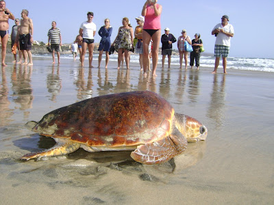 Alrededor de 60 niños, escolares de primaria de la localidad de Costa Calma, pudieron participar en la liberación de dos tortugas 'boba' (Caretta caretta) que tuvo lugar en las playas de esta localidad turística, lo que motivó que numerosos visitantes de otras nacionalidades participaran en la actividad.