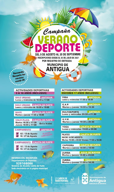Las actividades igual son de saludables que divertidas o atractivas para comenzar la práctica de un entrenamiento concreto, afirma el concejal de área, Fernando Estupiñán, ofrecemos este verano un calendario que reúne más de una decena de disciplinas, sumándose también los Campamentos Deportivos de Verano que se vienen celebrando desde julio, organizando los dos últimos en Antigua y Caleta de Fuste del 16 al 27 de agosto, y añade Estupiñán, siempre dando preferencia en la inscripción a empadronados en el Municipio que se inscriban por primera vez en los Campamentos.