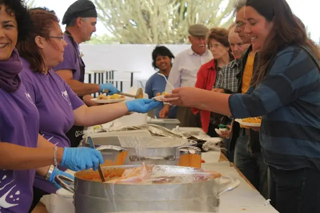 Paella, garbanzada y pollo asado ha formado parte de un menú, amenizado por vino, refrescos y preferentemente un fresco vaso de cerveza que les servirá de tentempié en el primer día de una jornada de cuatro días de ventas, espectáculos musicales, concursos y demostraciones artesanales.