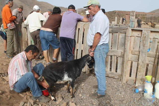 Apenas un silbo, un gesto o un golpe de voz era suficiente para agrupar unas diez cabras junto a la fuente donde les permitían refrescarse un momento antes de asustarlas con movimientos rápidos de brazos y palos para reunirlas en una pequeña gambuesa improvisada con pales y madera, donde son marcadas según sus propietarios y se ordeñan aquellas que no tienen baifo.
