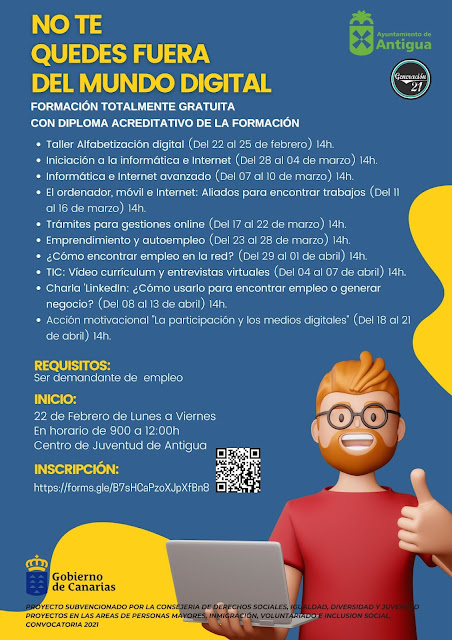 El programa formativo No te quedes fuera del mundo digital, propuesto y organizado por el Ayuntamiento de Antigua esta subvencionado con 14.800,21 euros por la Consejería de Derechos sociales, igualdad, diversidad y juventud del Gobierno de Canarias, permitiendo una formación gratuita de 14 horas, en horario de mañana y aportando un diploma acreditativo de la formación.