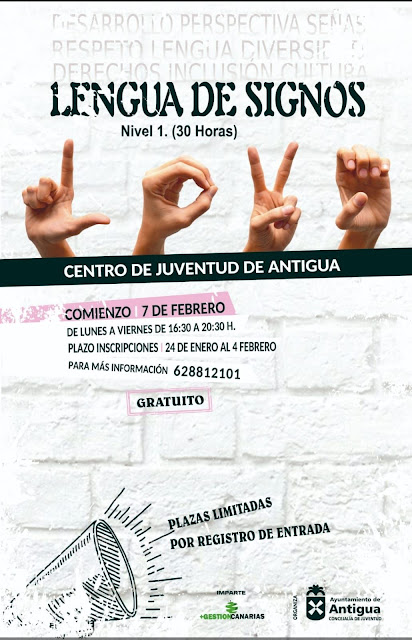 El Curso de Lengua de Signos Nivel 1 es impartido, durante 30 horas, por _Gestión Canarias, comenzando el 7 de febrero de lunes a viernes de 16:30 a 20:30 horas en el Centro de Juventud de Antigua.