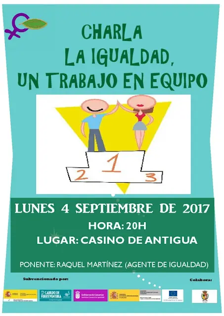 Este lunes 4 de septiembre a las 20:00 horas en el Casino de Antigua, tendrá lugar la charla La Igualdad, un trabajo en equipo.