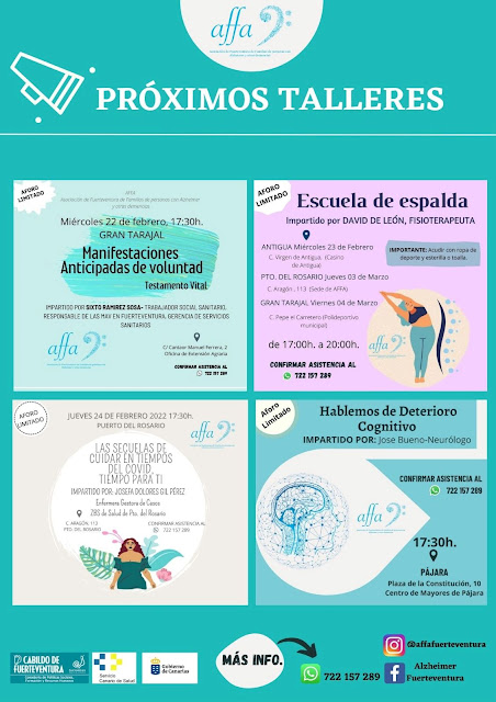 El Área de Salud de Fuerteventura, adscrita a la Consejería de Sanidad del Gobierno de Canarias, colabora con la Asociación de Personas con Alzheimer y otras demencias (Affa) en la puesta en marcha de los talleres que organiza la asociación y que se celebrarán durante este mes de febrero.