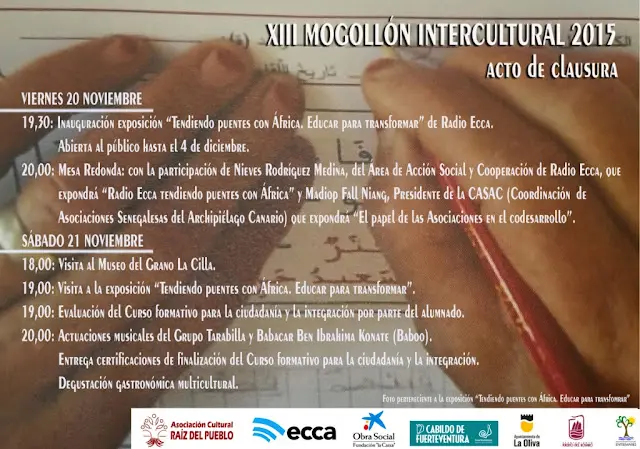 El viernes 20 de noviembre se inaugurará la exposición "Tendiendo puentes con África. Educar para transformar" que versa sobre la labor de Radio Ecca en este continente. La exposición podrá visitarse en las instalaciones de Raíz del Pueblo, en La Oliva, hasta el 4 de diciembre. Posteriormente, a las 20:00 horas, se celebrará una mesa redonda con la participación de Nieves Rodríguez Medina, del área de Acción Social y Cooperación de Radio ECCA que expondrá "Radio ECCA tendiendo puentes con África" y Madiop Fall Niang, presidente de la CASAC (Coordinación de Asociaciones Senegalesas del Archipiélago Canario) que expondrá "El papel de las asociaciones en el desarrollo".