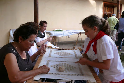Fefa, de Villaverde, y Mary, de Tindaya enseñaron con paciencia el arte del calado, y las diferencias entre una ‘ranga’ o cenefa y un ‘bizcochito’ o dibujo central, mientras Aramita, de Tindaya, tejía mochilas a su lado.