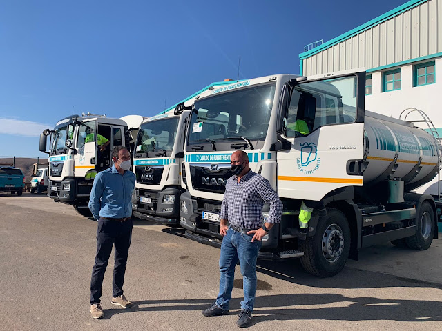 Estos camiones forman parte de las últimas adquisiciones que ha hecho la Corporación insular con una inversión de más de 1.600.000 euros. Así lo comunicó el presidente del Cabildo, Sergio Lloret López, en el acto de recepción de la maquinaria.