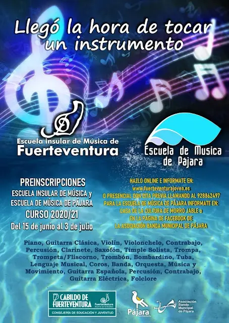 El Cabildo de Fuerteventura recuerda que el periodo de preinscripciones para nuevo acceso y matriculación para antiguo alumnado en la Escuela Insular de Música se encuentra abierto hasta el próximo 3 de julio. Las inscripciones pueden realizarse de manera online a través de la página web www.fuerteventurajoven.es o de manera presencial con cita previa, llamando al teléfono 928 86 24 97.
