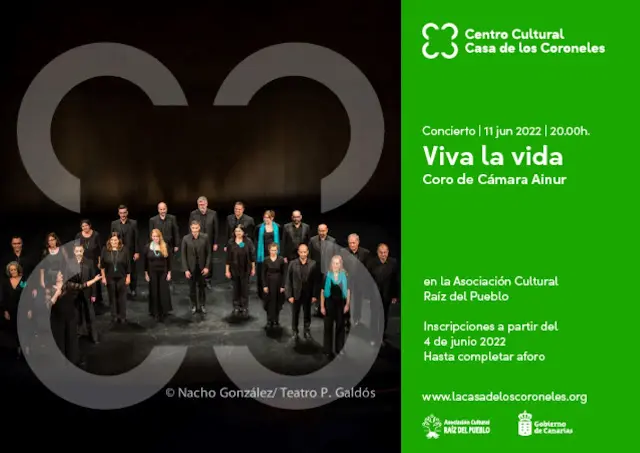 La Casa de los Coroneles, dependiente del Gobierno de Canarias, le comunica que se abre el plazo de inscripción, el día 4 de junio, y hasta agotar el aforo para asistir al concierto de Ainur "Viva la vida ", organizado por la Dirección General de Cultura.
