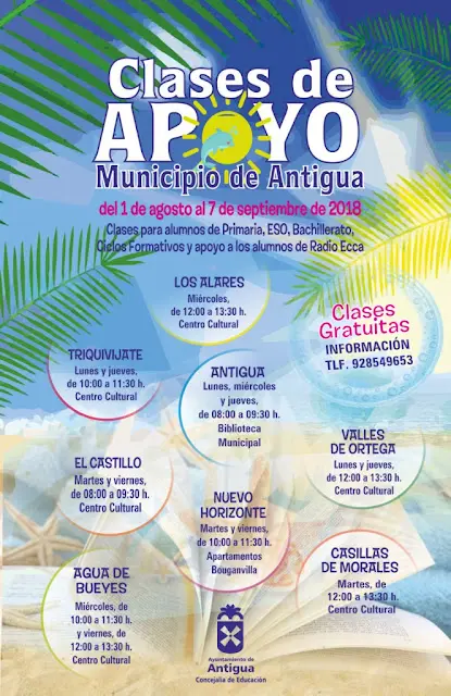 * Desde el 1 de agosto, el Ayuntamiento de Antigua imparte Clases de Apoyo Gratuitas en Los Alares, Antigua, Valles de Ortega, Casillas de Morales, Costa Antigua, Triquivijate, Caleta de Fuste y Agua de Bueyes.