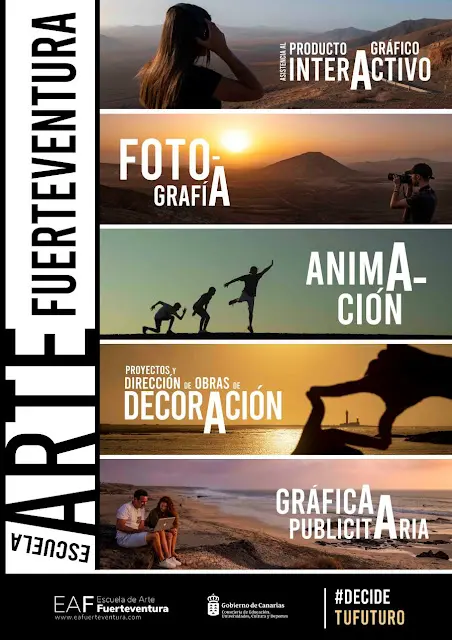 Puerto del Rosario, a 28 de mayo de 2020. "De la belleza de Fuerteventura aprendí que el arte y el diseño nacen de la propia naturaleza, que aquí, en mi tierra, puedo proyectar mis deseos al mundo…". Con esta idea creativa nace la campaña "Decide tú futuro", que impulsa la Escuela de Arte de Fuerteventura durante el periodo de matrículas, y en la que los propios alumnos son protagonistas, aplicando sus conocimientos a la creación de los contenidos gráficos y visuales de la campaña.