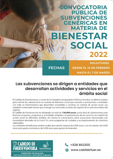 El Cabildo de Fuerteventura, a través de la Consejería de Políticas Sociales, ha abierto el plazo para solicitar las subvenciones que concede a asociaciones o entidades de la Isla que desarrollan actividades y servicios de acción social.
