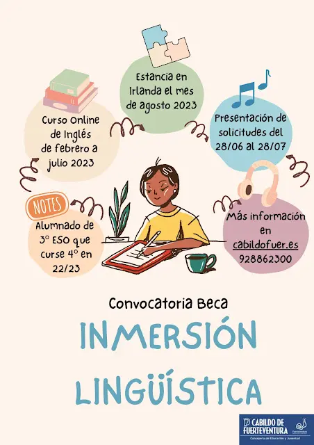 El Cabildo de Fuerteventura, a través de la Consejería de Educación y Juventud, que dirige María Saavedra Hierro, abre, por primera vez, una convocatoria para solicitar la beca de inmersión lingüística 2022, desde hoy, 28 de junio, hasta el próximo 28 de julio, ambos inclusive. La beca está dirigida al alumnado que haya terminado 3º de la ESO en el curso escolar 2021-2022 y se encuentre matriculado en 4º de la ESO para el curso escolar 2022-2023.