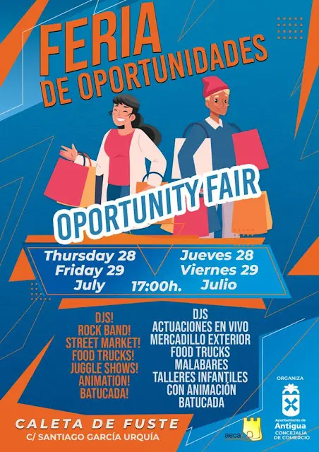 - En la calle de Caleta de Fuste a la fresca de la tarde, este jueves 28 y viernes 29, la Feria de Oportunidades ofrece Mercadillo de saldos, actuaciones musicales en directo, malabares, talleres infantiles, batucada y DJs en la calle peatonal Santiago García Urquía.