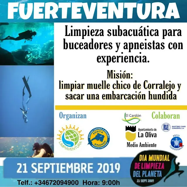 La Oliva, a 16 de septiembre de 2019. El colectivo ambiental Limpiaventura organiza este sábado día 21 de septiembre una limpieza de fondos marinos en Corralejo, una actividad que tendrá, como acción principal, el reflote y retirada de una embarcación turística hundida en la zona del Muelle de Corralejo, además de recoger otros desperdicios en el lecho marino.
