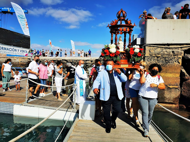 Sencilla y humilde procesión de Nuestra Señora de la Peña del Mar celebrada este fin de semana en Caleta de Fuste, que en su arraigada tradición, pasea siempre una vez al año por el moderno muelle El Castillo, siendo recibida por los marineros de toda la vida para subirla a un pequeño barco pesquero y navegar, echando flores en su estela costeando por el mar.