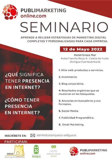 La inscripción es gratuita en la dirección de email [email protected] y el seminario se imparte por publimarketing on line.com, este jueves 12 de mayo a partir de las 17:30 horas en el Hotel Ereza Mar, avenida Franchy Roca en Caleta de Fuste.