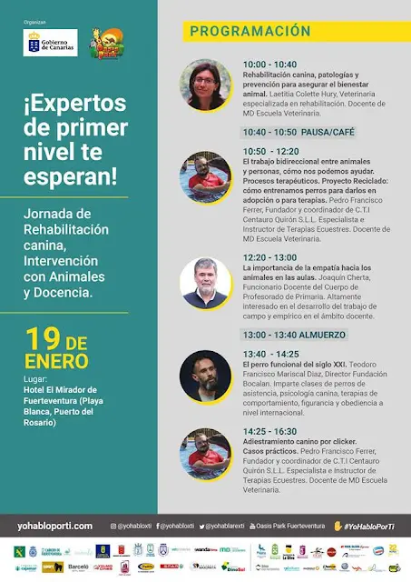 El sábado 19 de enero, expertos en cuidado y comportamiento animal estarán impartiendo formaciones en el Hotel Mirador de Fuerteventura de Puerto del Rosario, dentro de las Jornadas de rehabilitación canina, intervención con animales y docencia, de la campaña contra el maltrato y el abandono animal ¿Quién hablará por mi?, organizadas por Oasis Park Fuerteventura y el Gobierno de Canarias.