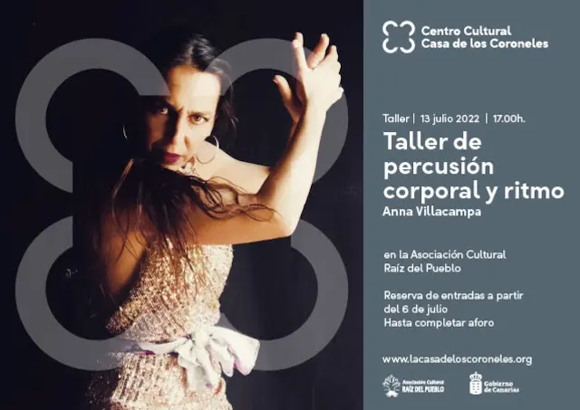 La Casa de los Coroneles, dependiente del Gobierno de Canarias, comunica que se abre el plazo de inscripción, el 6 de julio, para asistir al taller de Anna Villacampa “Percusión corporal y ritmo”, organizado por la Dirección General de Cultura a celebrarse en la Asociación Cultural Raiz del Puebl0 |