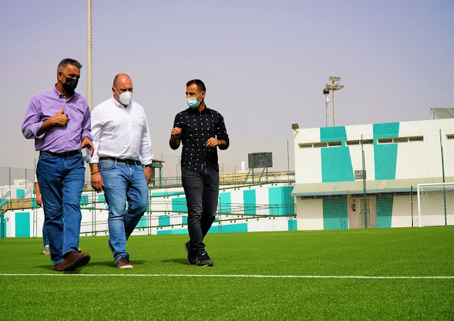 El presidente del Cabildo de Fuerteventura y responsable de Infraestructuras, Sergio Lloret López, y el consejero de Deportes, Claudio Gutiérrez, han visitado hoy por la mañana el campo de deportes Francisco Melián para comprobar in situ el final de las obras de mejora del campo de fútbol 1 de este complejo deportivo ubicado en Puerto del Rosario. “Aumentar la calidad de las infraestructuras deportivas para que nuestros deportistas cuenten con las mejores condiciones para entrenar y competir es uno de los compromisos que tiene el Cabildo y sobre el que seguimos trabajando”, manifestó el presidente de la Institución insular, Sergio Lloret. Desde la Consejería de Deportes se están realizando los trámites necesarios para obtener la homologación del campo, ya finalizado, por la Federación Canaria de Fútbol tras la instalación del nuevo césped artificial y otras mejoras en el equipamiento deportivo. En caso de obtenerse dicha homologación a tiempo, este fin de semana podrían reabrirse las puertas del estadio de nuevo a las competiciones de fútbol, anunció el vicepresidente primero y consejero de Deportes, Claudio Gutiérrez. Con un presupuesto global de 897.939 euros para los campos de juego 1 y 2, esta inversión en infraestructura está incluida en el Plan Insular de Cooperación a las Obras y Servicios Municipales (PICOS). Las obras se iniciaron el pasado mes de octubre y se han desarrollado en dos fases con el fin de entorpecer lo menos posible la dinámica de las instalaciones y tener siempre un campo siempre disponible para los entrenamientos. La mejora ha consistido en la renovación del césped artificial de los campos de juego 1 y 2, la ampliación de las zonas de calentamiento con césped deportivo del campo 1, la reposición de bordillos, rejillas, porterías y banquillos. Estos trabajos están siendo ejecutados por la empresa Obras y Pavimentos Especiales S.A. (OPSA).