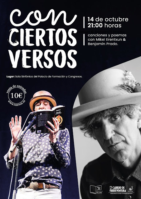 31 edición de la Feria Insular del Libro de Fuerteventura, que se desarrollará del jueves 14 al domingo 17 de octubre en la plaza del Palacio de Formación y Congresos, presenta el espectáculo poético musical Con Ciertos Versos, de la mano del conocido cantante Mikel Erentxun y el poeta Benjamín Prado.