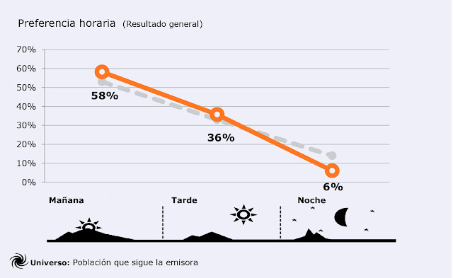 - La franja horaria más escuchada del día es la mañana con un 58% de audiencia