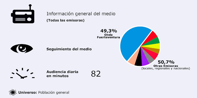Sin duda el dato más revelador es el que abarca todo el área del estudio y sus diferentes emisoras de FM. Uno de cada dos majoreros que sintonizan la radio en la isla escoge Onda Fuerteventura, el segundo sintoniza alguna de las otras emisoras presentes en el dial. Este alto porcentaje nos sitúa como claros líderes de audiencia con un amplio margen con respecto al resto de radios de la isla en todas las franjas horarias.