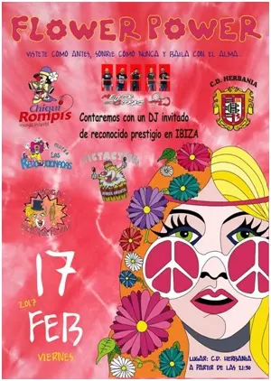 Este próximo viernes 17 de febrero en las instalaciones del Club Deportivo Herbania se realizará la tradicional fiesta de carnaval del club, a partir de las 21:30 horas, este año con la temática del conocido movimiento hippie de finales de los sesenta y principios de los setenta, denominado Flower Power.