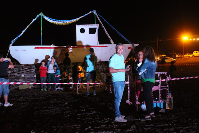 La noche de San Juan en Pozo Negro reunió más de medio millar de personas que disfrutaron en compañía de familia, vecinos y amigos de una espectacular hoguera donde se quemó la maqueta de un barco pesquero a escala en el que previamente todo el mundo dejó la huella pintada de su mano o escribió aquello que quería quemar.