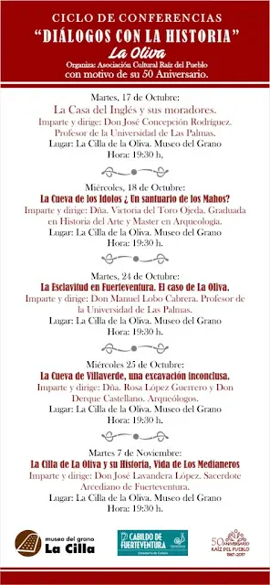Dentro del programa de actos elaborado con motivo del 50 aniversario del nacimiento de la Asociación Cultural Raíz del Pueblo, se ha organizado un ciclo de conferencias denominado "Diálogos con La Historia" donde conferenciantes expertos en la materia nos acercarán a la rica historia de nuestro pueblo, La Oliva, y su influencia en Fuerteventura y Canarias.