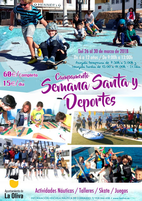 Del 26 al 30 de marzo tendrá lugar el "Campamento Semana Santa y Deporte 2018" para usuarios de 7 a 13 años en la Escuela Náutica de Corralejo, y en el Pabellón Municipal José Perdomo Umpiérrez la "Colonia Urbana Semana Santa 2018", para usuarios de 3 a 12 años.
