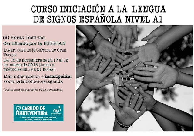 El Cabildo de Fuerteventura, a través de la Consejería de Juventud, que dirige Rosa Delia Rodríguez, ha abierto el plazo de inscripción para el Curso de Iniciación a la Lengua de Signos Española Nivel A1, que se impartirá del 15 de noviembre de 2017 al 13 de marzo de 2018 en la Casa de la Cultura de Gran Tarajal.