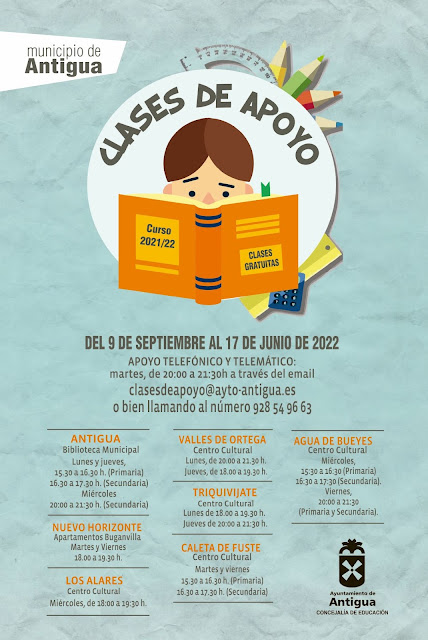 Las Clases de Apoyo se imparten en la Biblioteca Municipal de Antigua los lunes y jueves para primaria en horario de 15:30 a 16:30 horas y para estudiantes de secundaria los mismos días de 16:30 a 17:30 horas y los miércoles de 20:00 a 21:30 horas.