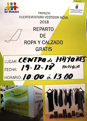 En el Ayuntamiento de Antigua desde la concejalía de Servicios Sociales y en colaboración con la ONG Ser Humano, organiza un Reparto gratuito de Ropa y Calzado para toda persona o familia que lo precise. Valoramos y apoyamos la labor social de la ONG Ser Humano que cierra en Antigua su campaña en toda Fuerteventura, señala la concejala Columba López, y que facilita gratuitamente ropa y calzado a quien lo precise, de todas las tallas y números, así como diferentes tejidos y prendas según la temporada del año.