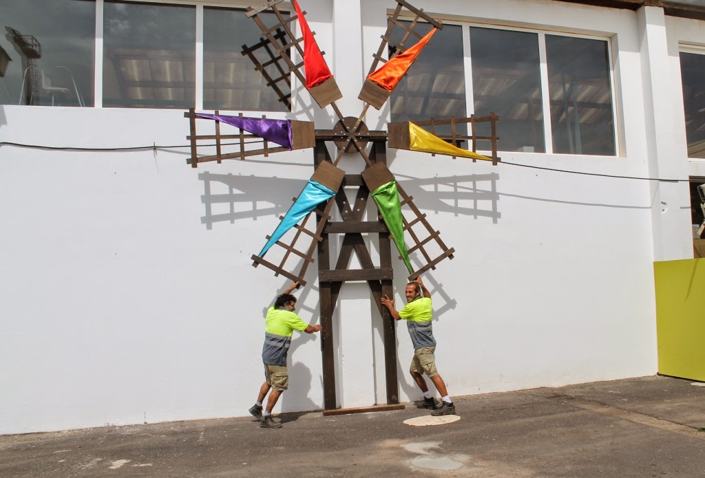 con una estructura azul, roja y blanca. Ayer se instaló también la molina que