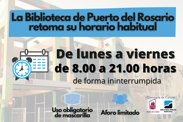 Fuerteventura.- La Concejalía de Cultura del Ayuntamiento capitalino, que dirige Aurelia Vera, comunica que, a partir del miércoles 4 de noviembre, la Biblioteca municipal retoma su horario habitual de atención al público de 8.00 a 21.00 horas de forma ininterrumpida.