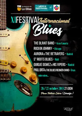 La Oliva, Fuerteventura a 3 de octubre de 2018. El Festival Internacional de Blues regresa a Corralejo para celebrar su undécima edición, el viernes 26 y sábado 27 de octubre, en la Plaza Patricio Calero, con un cartel plagado de artistas míticos del panorama americano, africano, europeo, nacional y canario, y añadiendo un intenso programa paralelo que incluye el Blues en la Calle de las bandas locales, la feria gastronómica Gastro Blues, y un taller de kora (instrumento africano) impartido por la banda maliense S" Roots Blues.