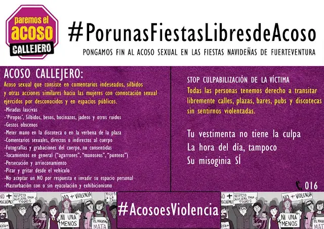 Una estudiante majorera del Máster en Estudios Interdisciplinares de Género (UAM) y graduada en Periodismo y Comunicación, ha lanzado una campaña contra el acoso callejero y las agresiones sexuales previa a la celebración de fin de año de la capital de Fuerteventura, una de las fiestas más multitudinarias de la Isla. Dicha celebración, que tendrá lugar en la plaza de la Paz de Puerto del Rosario, contará con numerosos carteles contra el acoso y las agresiones sexuales a las mujeres ya presentes en algunos establecimientos y comercios de la capital majorera.