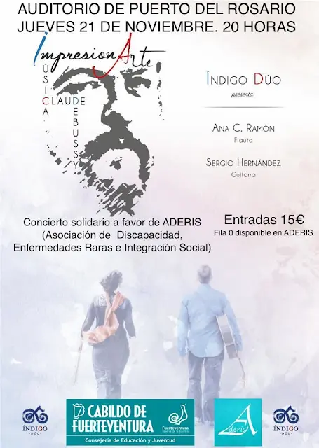 El Cabildo de Fuerteventura, a través de su Consejería de Educación y Juventud, que dirige María Jesús de la Cruz, presenta el concierto solidario 'ImpresionArte', homenaje a Claude Debussy, en beneficio de la Asociación de Discapacidad, Enfermedades Raras e Integración Social (Aderis), que se celebrará mañana jueves 21 de noviembre a las 20.00 horas en el Auditorio Insular de Puerto del Rosario. Entrada a 15 euros, donde todos los participantes podrán interactuar con los artistas en el escenario, de una forma dinámica y a través del uso de las nuevas tecnologías.