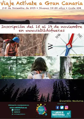 Por ello, entre los días 5 y 8 de diciembre se llevará a cabo el viaje multiaventura 'Actívate' a Gran Canaria para jóvenes de Fuerteventura de entre 18 y 35 años, cuyo alojamiento será en el Campamento El Garañón y se llevarán actividades tales como rápel, orientación, senderismo y ruta nocturna, entre otras.