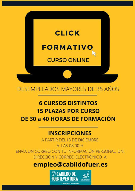 La Consejería de Empleo del Cabildo de Fuerteventura comunica que se han cubierto todas las plazas disponibles en tres de los cursos de formación online del programa ‘Click Formativo’, dirigido a desempleados, prioritariamente mayores de 35 años.