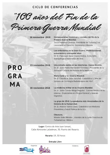 En Fuerteventura el 30 de noviembre, a las 19:30h., en el centro de arte Juan Ismael, de Puerto del Rosario, tendrá lugar la clausura del ciclo de conferencias "La Sanidad en el I Guerra Mundial",organizado por la Asociación Canaria Salud y Sonrisas, junto con la Asociación TuSantaCruz, de Tenerife y la colaboración del ayuntamiento de Puerto del Rosario.