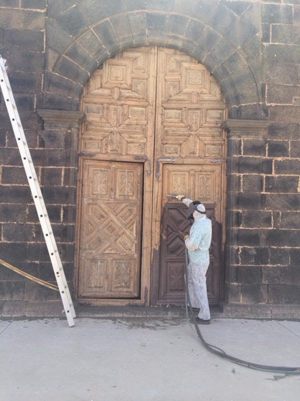 También se ha actuado sobre la puerta principal de tea, que presentaba un estado muy deteriorado y que había sido objeto de pintura con sucesivas capas que se habían ido superponiendo durante décadas. Se han eliminado estas capas y se ha tratado de recuperar las tonalidades originales, asegurando en la media de lo posible la estructura de la puerta, ya que estaba muy deteriorada.