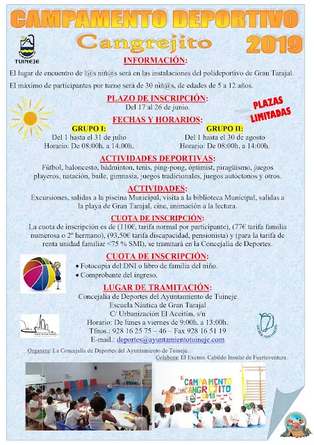 Fuerteventura.- El Campamento Deportivo Cangrejito 2019, para niños y niñas con edades comprendidas entre los 5 y los 12 años, se celebrará en Gran Tarajal.