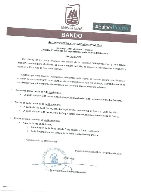 El Ayuntamiento de Puerto del Rosario, a través de su Alcalde, Juan Jiménez, ha hecho público un BANDO con motivo de la celebración del evento #Salporpuerto y una Noche Blanca en la zona alta de la ciudad, este sábado, 09 de noviembre, a fin de informar sobre la prohibición de la circulación y estacionamiento de vehículos por cortes y ocupaciones de calles y así poder desarrollar la actividad prevista de dinamización comercial con todas las garantías de accesibilidad y seguridad posibles.