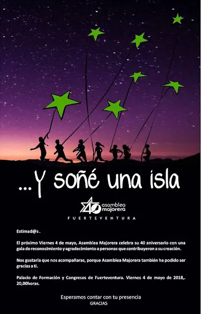 En torno al lema "... y soñé una isla', Asamblea Majorera celebrará el próximo 4 de mayo un encuentro de homenaje y agradecimiento a colaboradores, fundadores y colectivos sociales, que durante estas últimas cuatro décadas han participado en el nacimiento y desarrollo de la formación política, dentro de un programa de actividades que se puso en marcha el pasado mes de diciembre con la tradicional cena navideña.