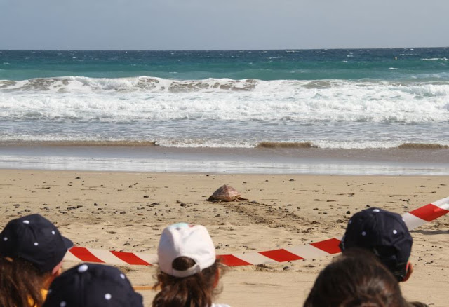 Fuerteventura.- Escolares del CEIP San José de Calasanz participan en liberación de ejemplar recuperado de tortuga boba en Playa Blanca