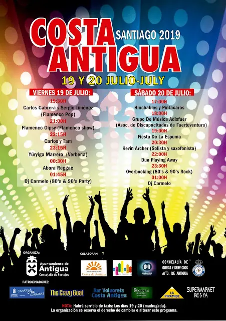 Sebastian Martin 11/jul/19 - 14:47 Siguiente chevron_right Fuerteventura.- Las Fiestas de Costa de Antigua 2019 en Honor de Santiago Apóstol, se celebran el fin de semana del 19 al 20 de julio con diversos actos y verbenas. Sebastian Martin Etiquetas Fuerteventura fin se semana fiestas 20 Siguiente chevron_right