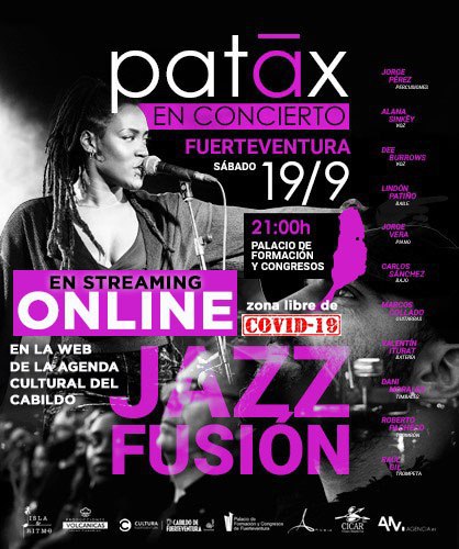 Fuerteventura.- El grupo de jazz fusión Patãx, uno de los proyectos musicales más veteranos y rompedores en su género del panorama nacional e internacional, ofrecerá este sábado, día 19 de septiembre, a partir de las 21.00 horas, un concierto en streaming desde el Palacio de Formación y Congresos de Fuerteventura, a través de la agenda cultural de la web del Cabildo de Fuerteventura, www.cabildofuer.es.