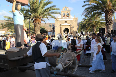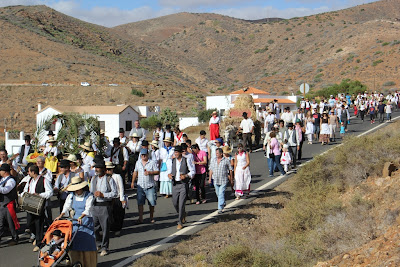 Fuerteventura homenajeó hoy a su Patrona, al Virgen de la Peña, con una multitudinaria romería que desde las 16.00 horas congregó a cientos de personas por el cauce del barranco de la Vega de Río Palmas en torno a una veintena de carretas representativas de todos los municipios, del Cabildo y de colectivos de toda la Isla. Tras la ofrenda de productos de la tierra, celebrada al llegar a romería hasta la ermita de la Virgen de la Peña, la atención se centrará durante toda la noche en los miles de peregrinos que desde todas las localidades de la isla se dirigen hasta la Vega de Río Palmas caminando.